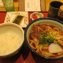 きしめんのスープは一般的には醤油味ですが、こちらでは塩や味噌も選べます。せっかくなので名古屋っぽい味噌を選択。