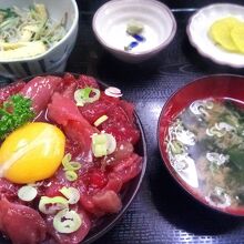 青森駅から徒歩5分程のところにある”AUGA(アウガ)”地下1Fにあるカウンター席だけの食堂。AUGAの1Fは市の窓口部門があり、わかりやすい。地下には魚や乾物を扱う市場が広がる。オススメの中落丼には大間産(?)マグロの中落が丼からはみ出んばかりに盛られた渾身の一品。生卵をかけることで濃厚さがより増して腹いっぱいになること間違いなし!