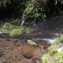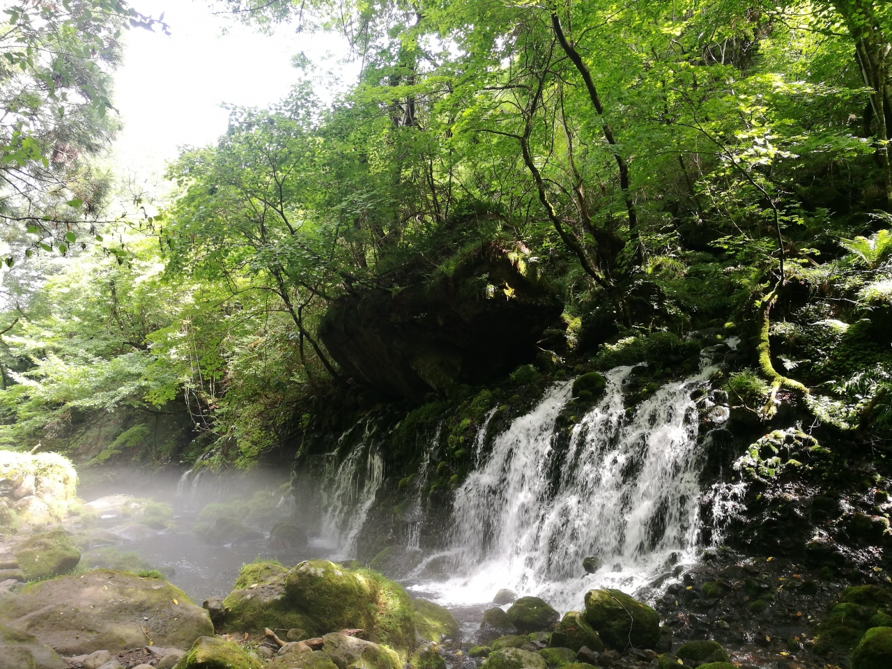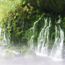 幾筋もの線となってコケの上を流れ落ちていく。白い水瀑と緑の苔が美しい、鳥海山の伏流水が作り出す神秘的な世界。木立から木漏れ日が射し込み、水煙が立ちこめるその景観は感動的。滝から立ちこめる霧を全身で浴びるのは夏の暑い盛りには最高の贅沢。