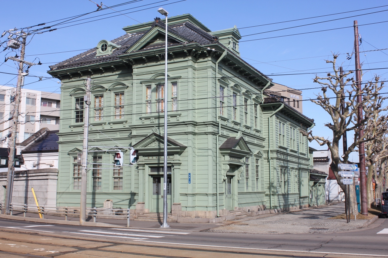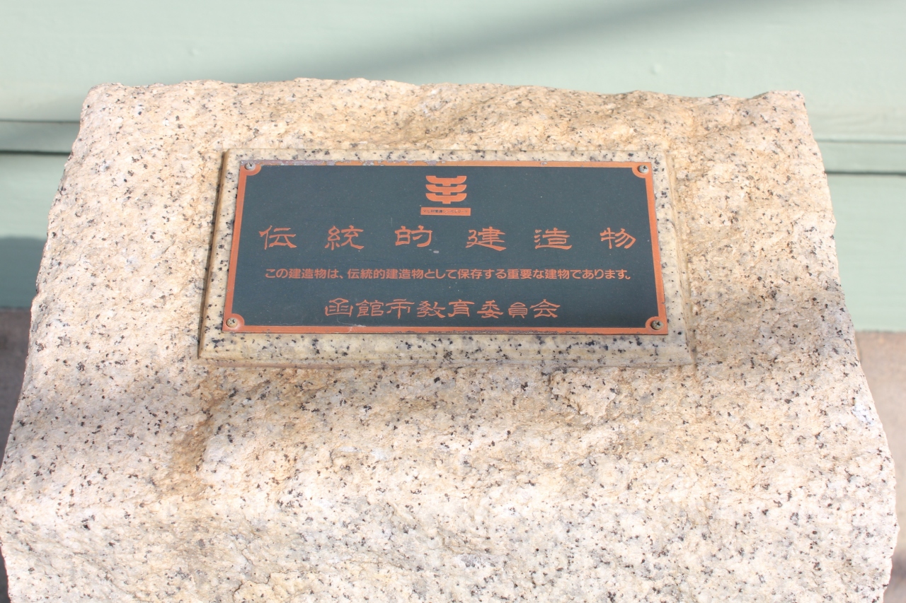 函館市電通り沿いで基坂との交差点にあり、淡い緑色(ペパーミントグリーン)一色に塗られたハイカラな建物で、函館市の「伝統的建造物」のプレートがありました。