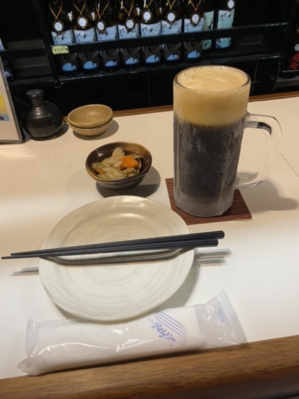 先ずはエビスのハーフ&ハーフビール!そして島魚の刺身5点盛り合わせ。赤兎馬ロックに島茄子天ぷら!