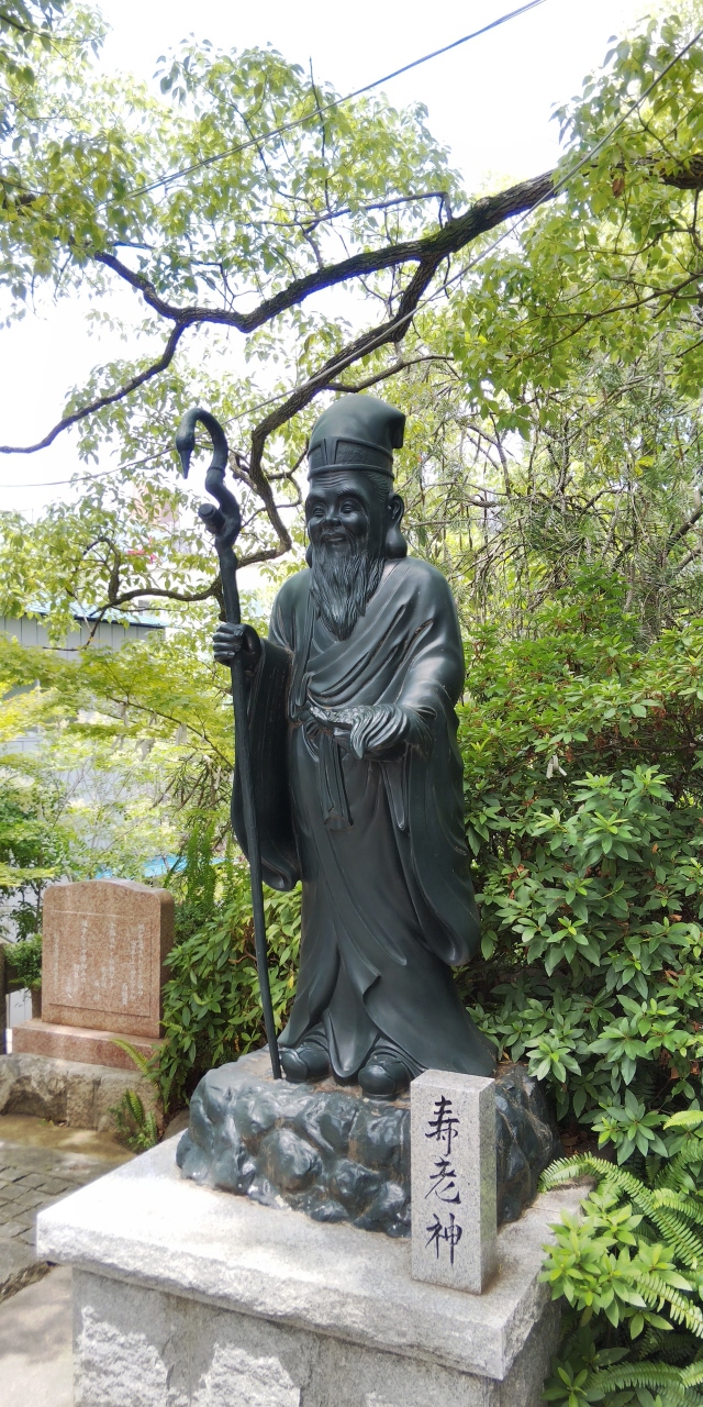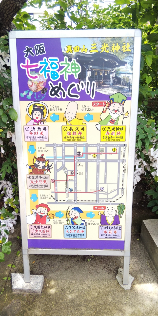 大阪七福神めぐりは、大阪市内の三光神社や今宮戎神社、四天王寺布袋堂など七つの寺社で構成されています。今回は真田幸村公のゆかりのある三光神社=寿老人にお邪魔しました。境内の入口近くには七福神の大きめの看板を見かけました。