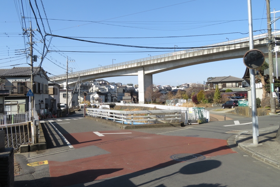 この「栗原巡礼大橋」は、その巡礼橋から上を見上げると、かかっている巨大な橋です。平成10(1998)年に開通し、座間市立野台とさがみ野方面をつなぐ最短距離となっています。巡礼街道ではありませんが、立地的に関係することから、この名が付けられたのではないかと思います。