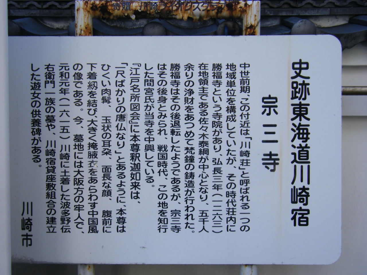 2020年11月に川崎を散策した際に立ち寄りました。宗三寺は京急川崎駅から歩いて数分の場所にある曹洞宗の寺院となります。創建等の詳細は不明でしたが、後で調べたところ鎌倉時代くらいまで遡ることができるようで、かなりの歴史がある寺院のようです。すぐ裏手を京浜急行が通っているため、やや賑やかな雰囲気はありますが、趣のある本堂と開放感のある境内が印象的な寺院でした。川崎宿の散策に合わせて訪問されると良いかと思います。