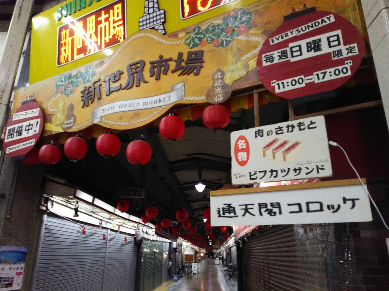 スーパーレトロ商店街、開いているお店は少ないのですが 開いているお店は、かなりレトロで年季入った現役商店です。毎週日曜日11:00ー17:00フリマとのこと。肉のさかもとのビフカツサンドや通天閣コロッケなどがいただけます。これだけの観光地なのにちょっとさみしくなる場所です。