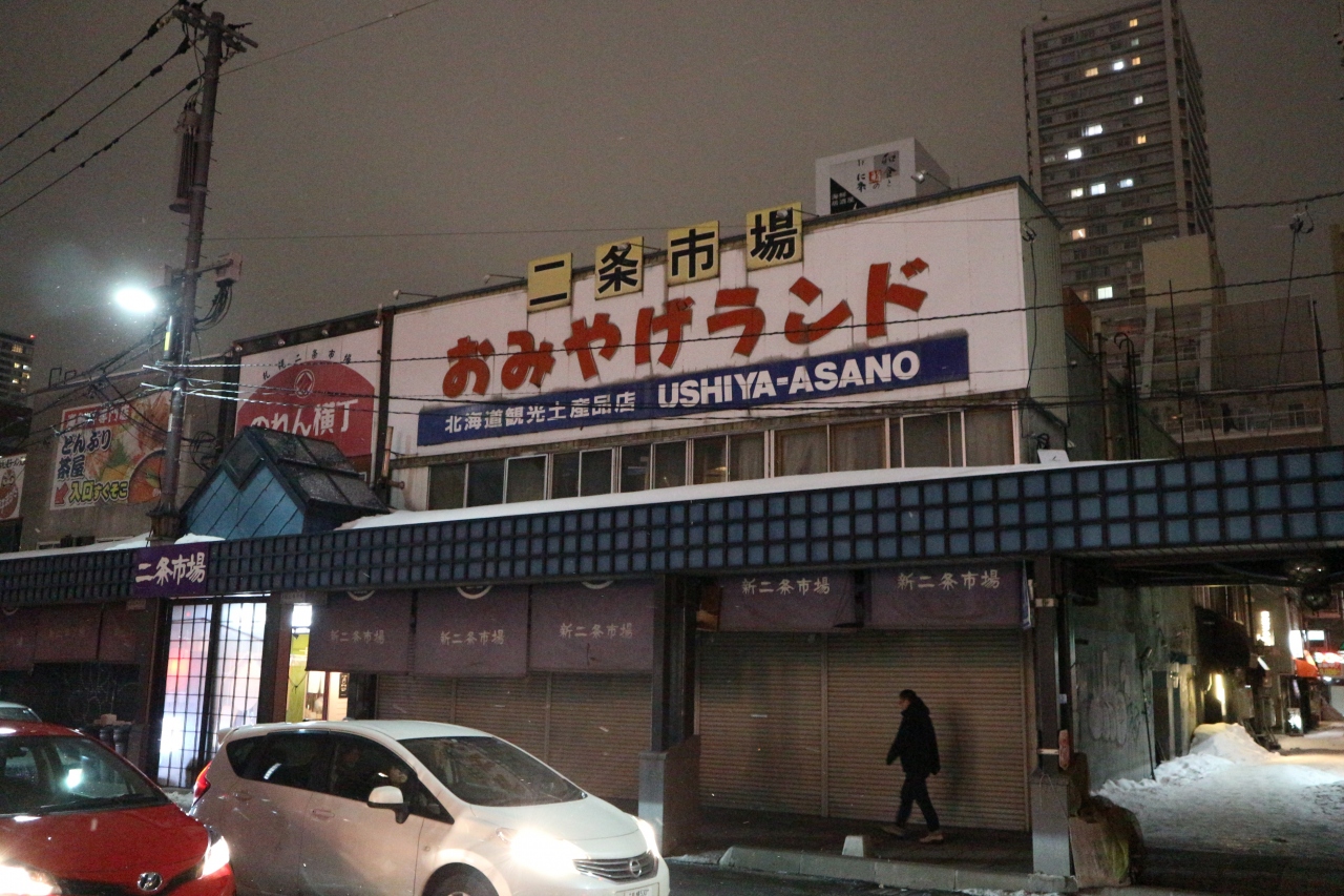 札幌で海産物をお求めなら皆さんここへ行くでしょう。じょんとらべる太は、レトロを求めて行きました。シャッターの看板を目当てに突き進みましたが、夜行くとかなりくらいです。昭和のお土産屋、市場という雰囲気をしっかり残している場所でした。