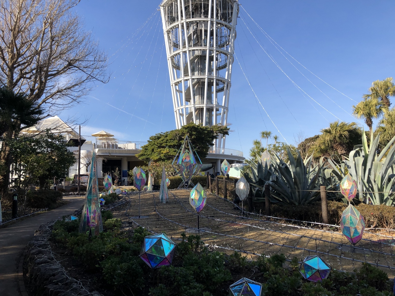 サムエル・コッキング苑の中、シーキャンドル近くの緑地が、クリスタルのデコレーション「宝石」で飾られています。夜のライトアップがメインですが、昼間でも太陽の光があたって、「宝石」が虹色に輝いて、キラキラときれいです。
