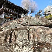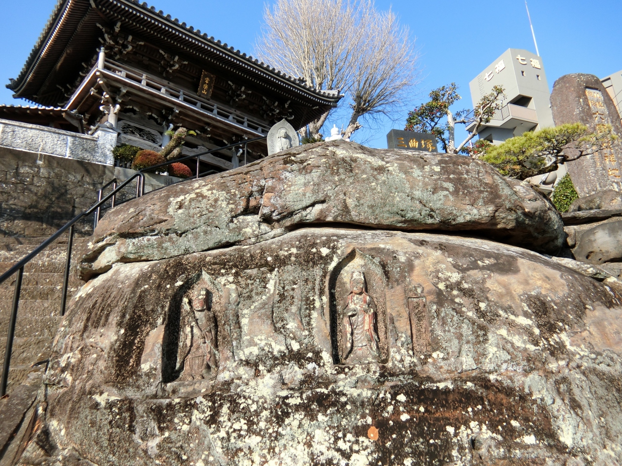 諌早公園から橋を渡っていくと慶巖寺があります。少し小高いところにあります。山門までの両側の崖に、石仏が彫りこまれて、これがすごいです。磨崖仏群三十三観音と呼ばれ、これを見るだけでもこの寺を訪れる価値がある。