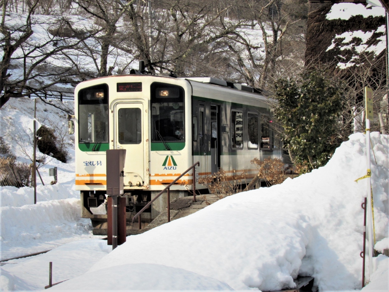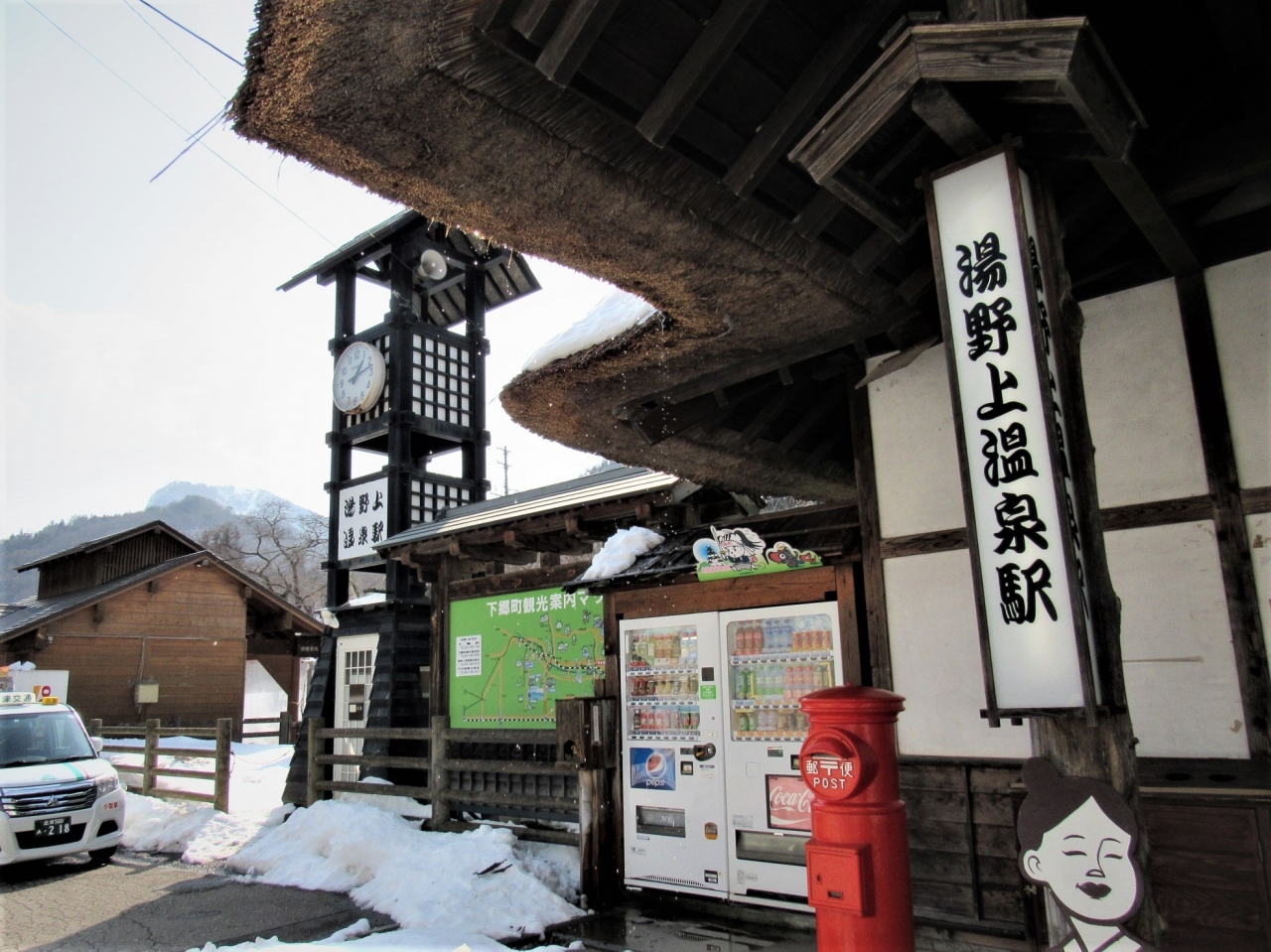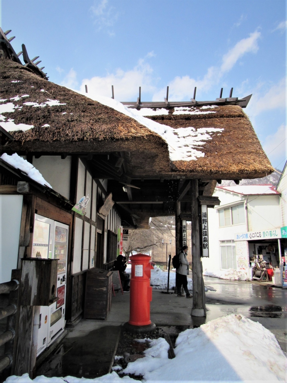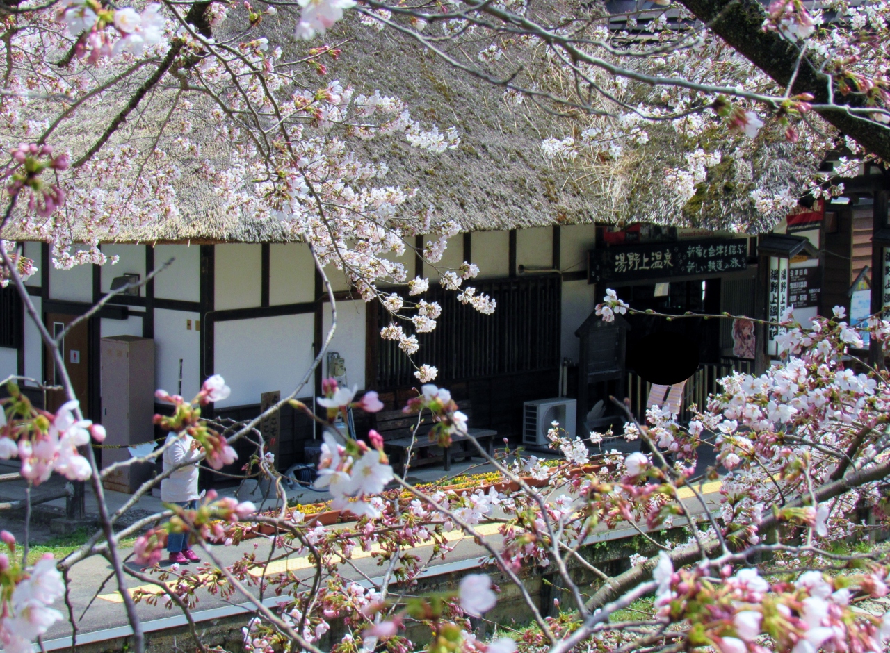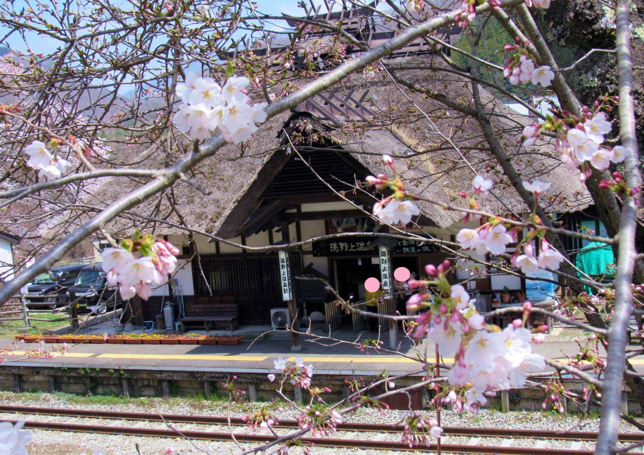 桜と雪と四季折々茅葺屋根の素敵な駅舎