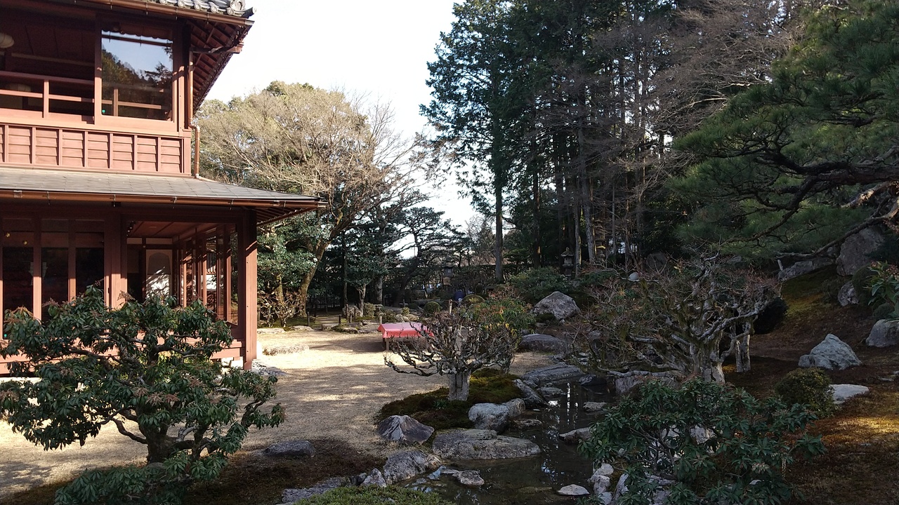清流が園内に流れ沢山の樹木、中でも立派な枝振りの松は歴史の流れを感じました。