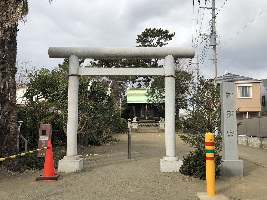 JR茅ヶ崎駅から歩いて10分、国道1号線から北の方へ少し入ったところにあります。鳥居の横には「神明宮」と書かれた石柱が立っており、30mほど先に拝殿があります。拝殿の横には、境内の2-3倍の広さの公園が隣接していて、滑り台などの遊具がありました。