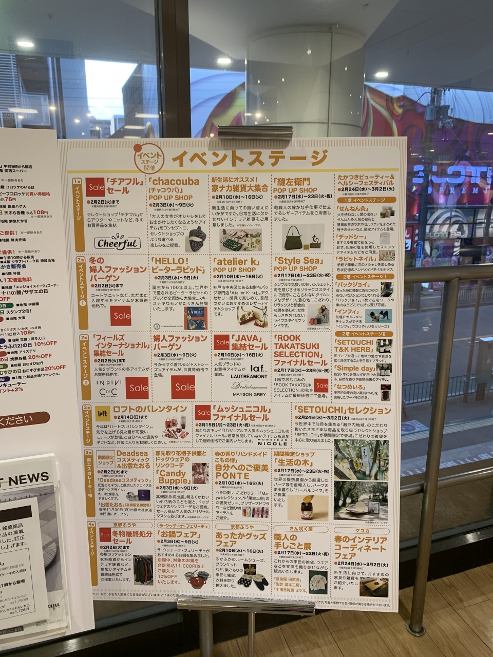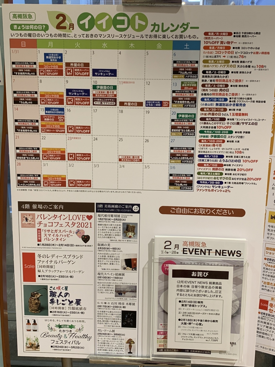 「2月イイコト カレンダー」や「イベントステージ開催」のポスターが貼ってあるので