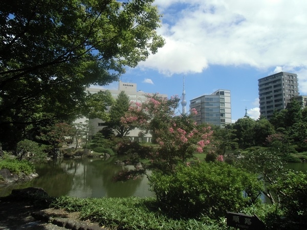中心に「心」字をかたどった池を配し、かつては隅田川の水を引き入れ、潮の干満によって変化する景観を楽しむ、いわゆる潮入り池泉廻遊式庭園です。