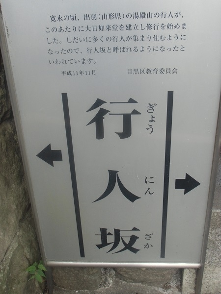 説明板によると、寛永の頃、出羽の湯殿山の行人がこのあたりに大日如来堂を建立し修行を始めたのが名前の由来。