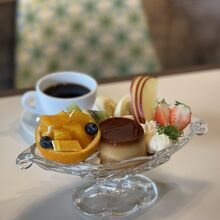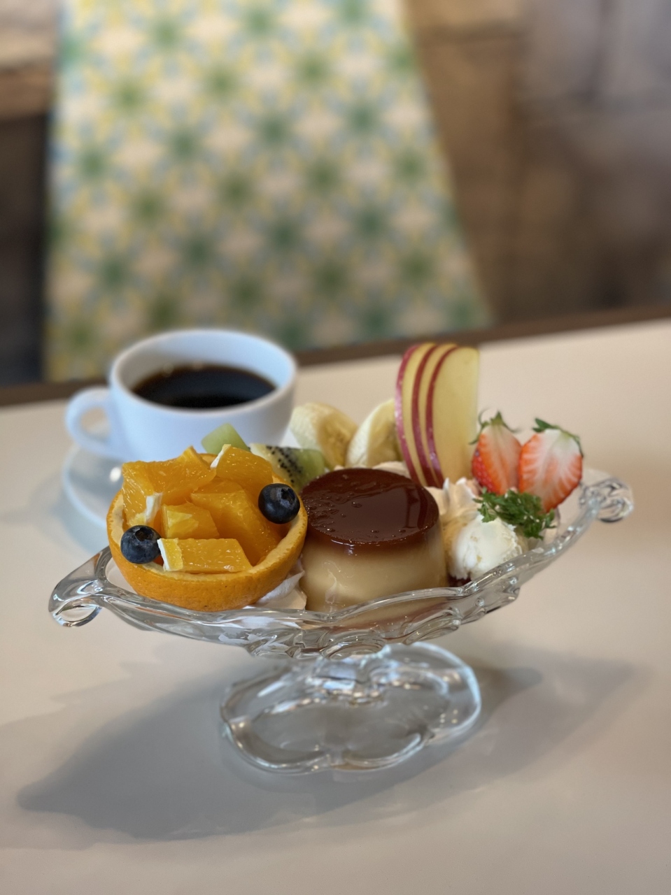 プリンアラモードとコーヒーを注文。テーブル上にある呼び出し端末でスタッフを呼ぶシステム。特筆する味ではないが立地良くゆっくりできるのは良い。