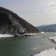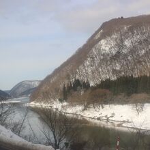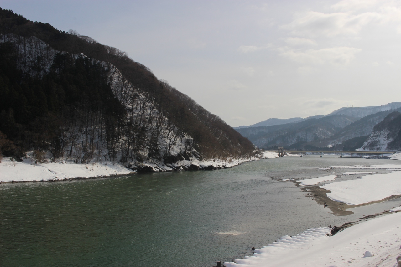 車窓から見える冬の最上川は夏とは違って雪化粧の山々と青い最上川の組み合わせが移しかったです。