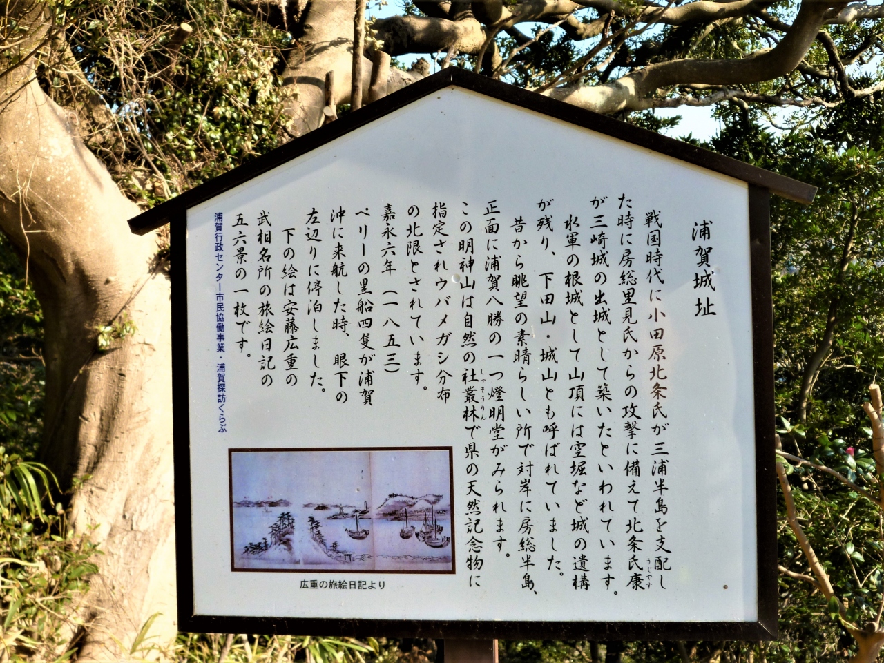東叶神社にお参りしたら奥の明神山(境内)にも;山頂は奥ノ宮/東照宮/神明社/勝海舟の断食祈願と<浦賀城跡>がありました。浦賀城は三浦氏が築城、北条氏は改修して三崎城の支城で北条水軍の拠点;房総半島の里見氏の攻撃に備えて…でも、房相一和後(房相=房総/相模)に廃城;戦国時代です! 浦賀港入口の城址からは浦賀水道/房総半島が♪