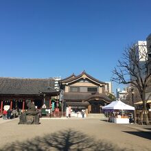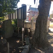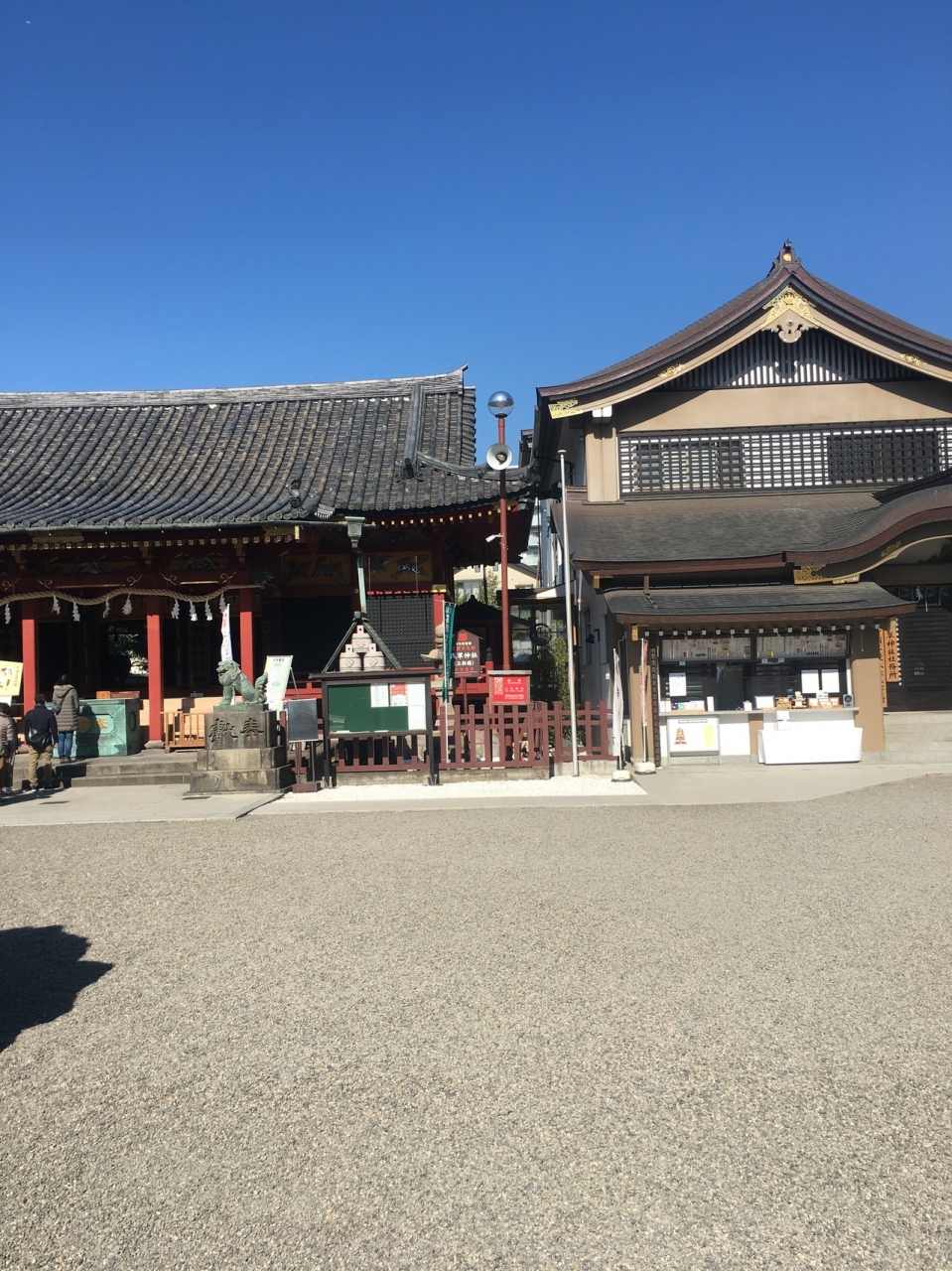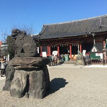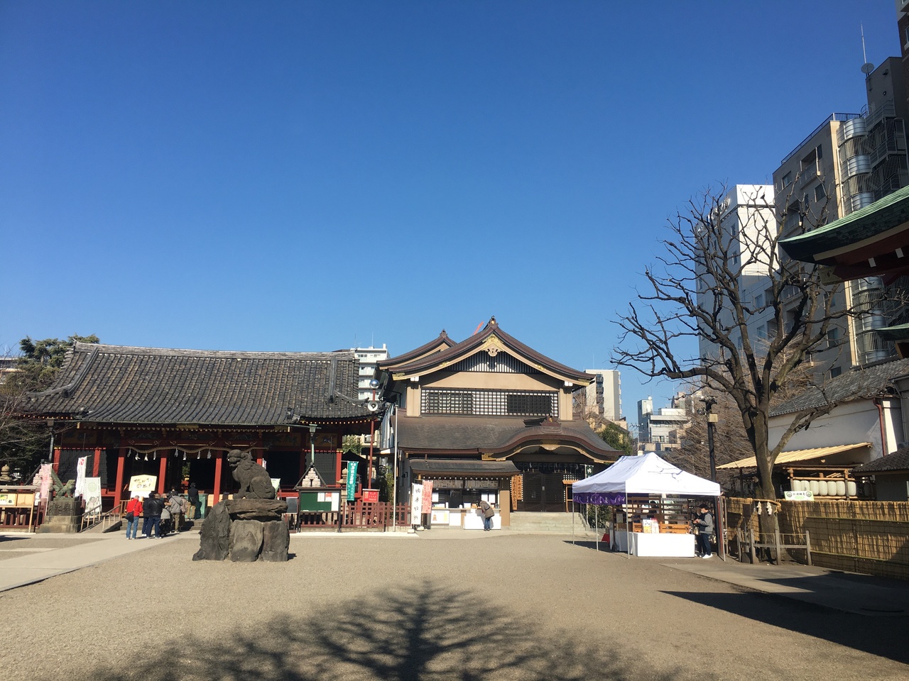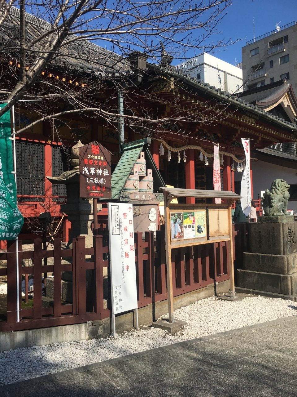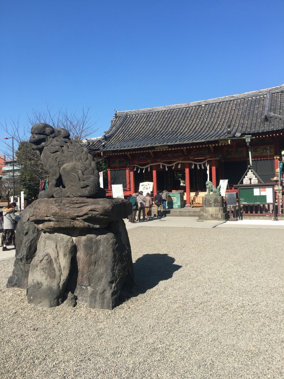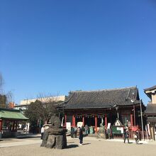 浅草寺に隣接した神社で、浅草寺本堂とニ天門の真横にあります。石碑等の小物が多く展示されていました。赤い社殿で参拝客が絶えず、並んでいると狛犬像が睨みつけているのが目に入りました。出入口がいくつかある境内です。