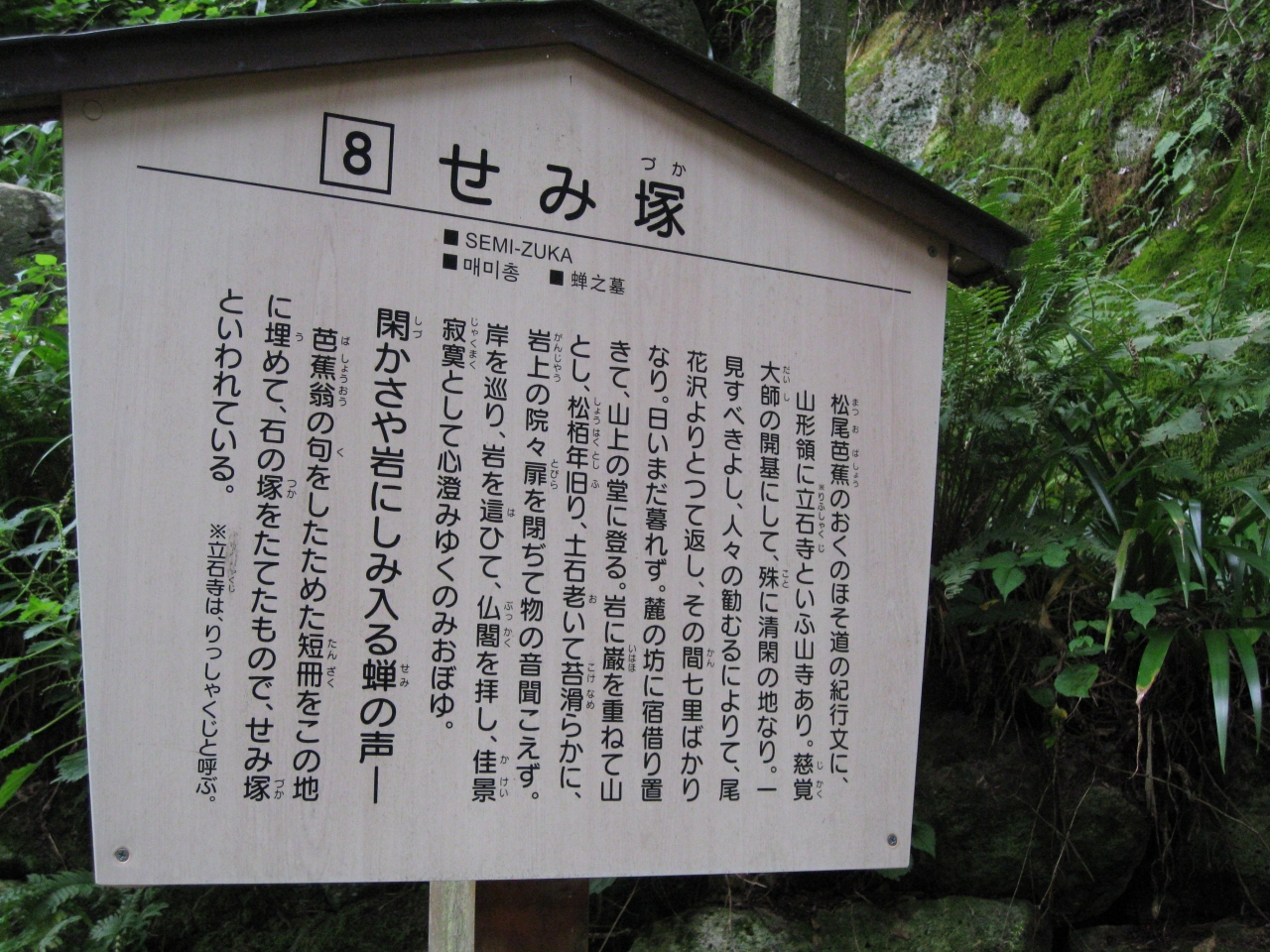 芭蕉が奥の細道道中で、有名な岩にしみいる蝉の声の俳句を書いた短冊をこの地に埋めたので「せみ塚」と呼ばれるようになったそうです。