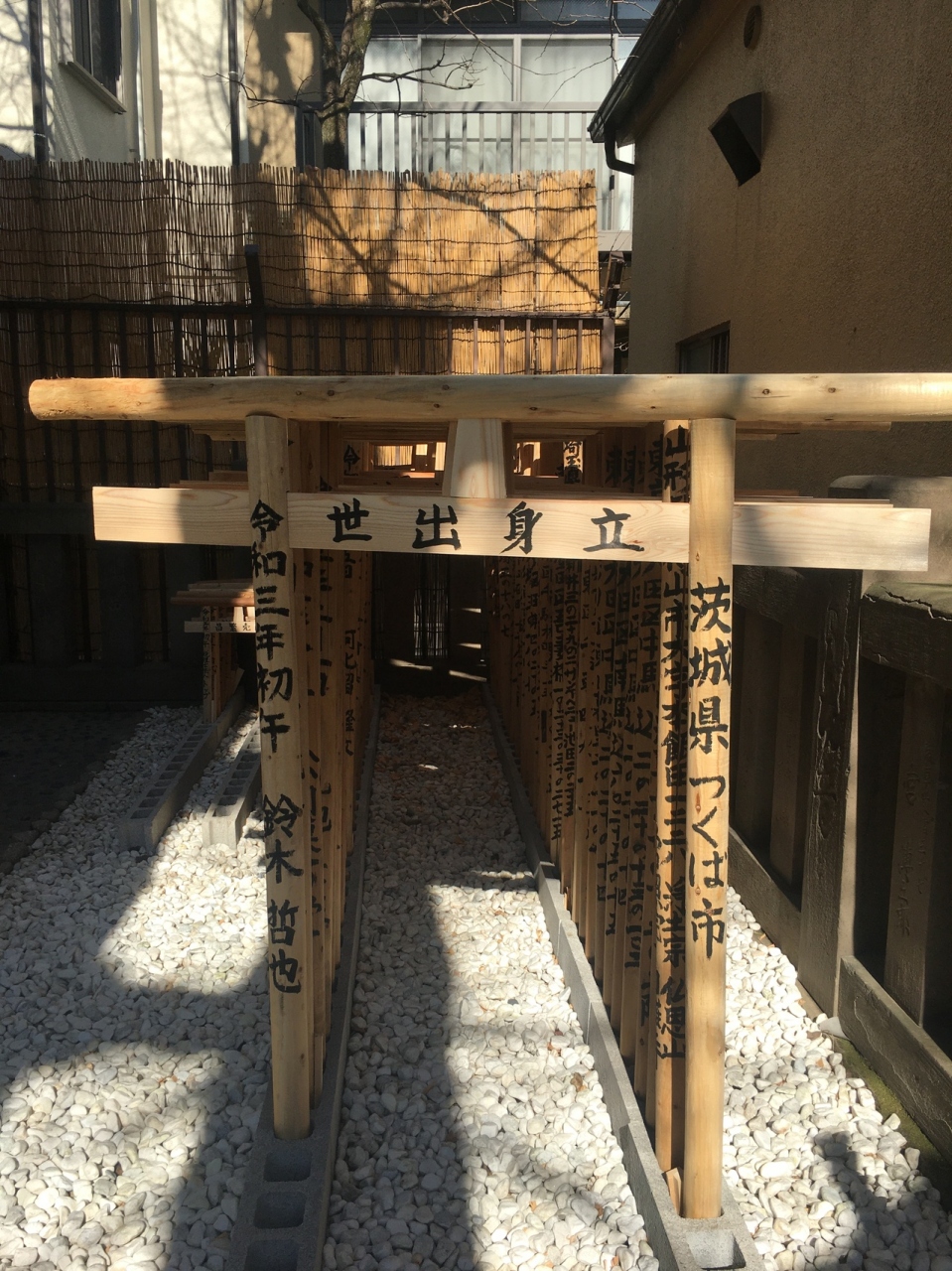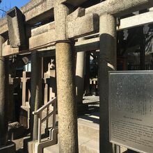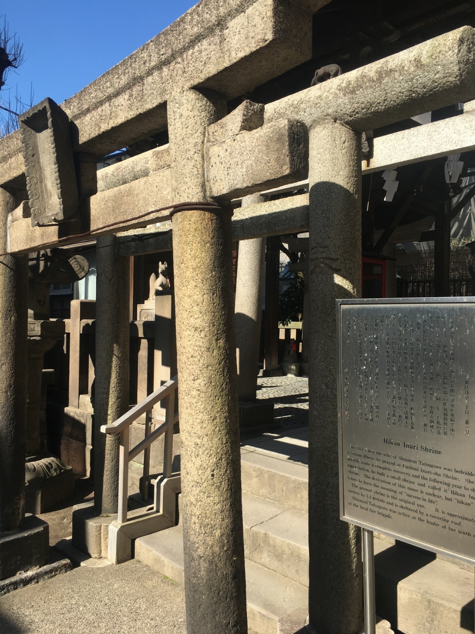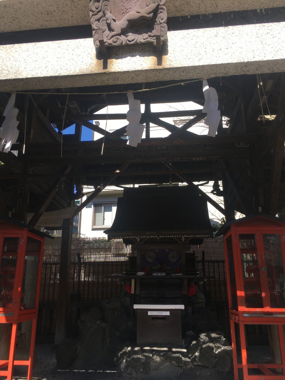 鳥居を潜ると空間になっていて、燈籠の左右にまた鳥居が3つ重なってありました。古い建物で中に入ると小さな社があり、溶岩のような場所に狐の像がのっていました。横には白い狐がたくさん並んでいましたが此方は可愛らしい姿でした。