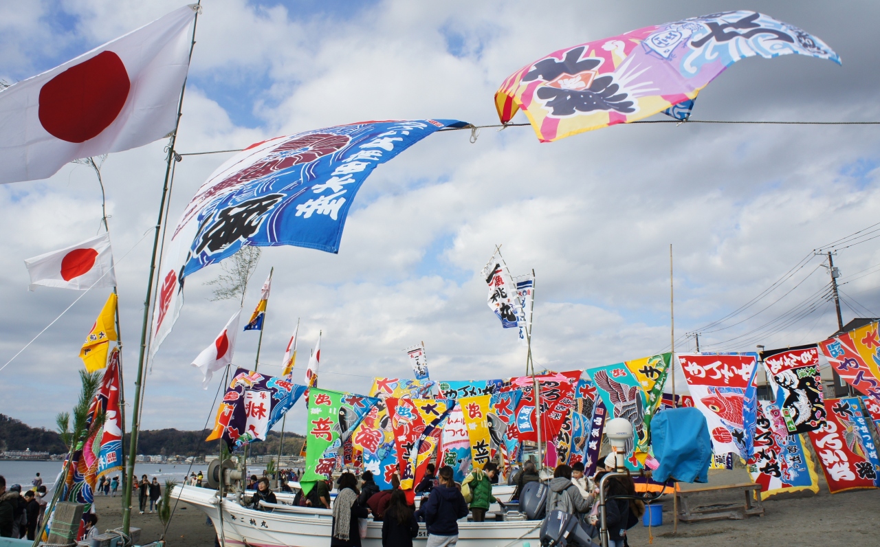 毎年1月2日の10:00頃から、漁師さんの仕事始め”船おろし”が行われる。前の年の漁の無事に感謝し、今年の一年の豊漁と安全を祈願する祭です。大漁旗を掲げた漁船が海岸に勢ぞろいし、船上から海に向かってみかんやお菓子が撒かれ、集まった人が競って拾いお祭り。袋を持参するといいかも。
