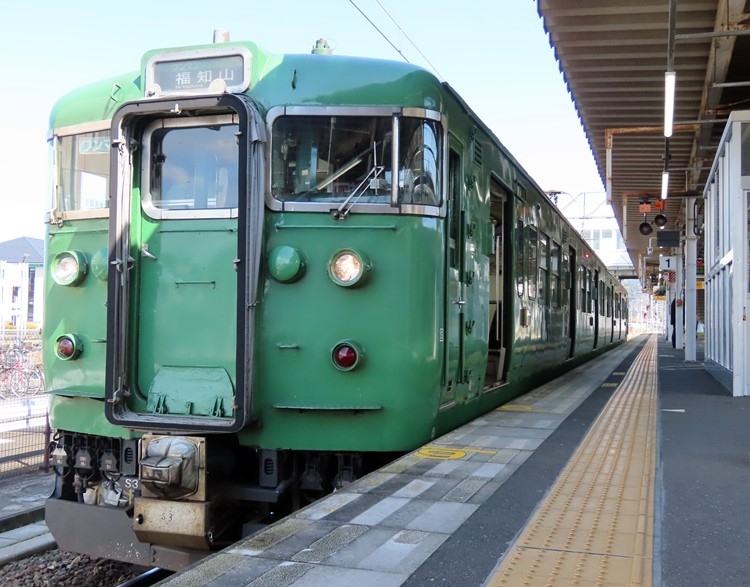 東舞鶴から綾部まで5駅、営業キロ26.4キロの京都府内を走るローカル線。山陰線・舞鶴線を経由した特急「まいづる」が京都発で運行されています。京都府北部の代表的観光地、天橋立への立ち寄りを意識すると京都丹後鉄道を利用するので、この舞鶴線は乗る機会があまり多くはないのかも。このときは東舞鶴から綾部まで山陰線へ直通する「福知山行き」を利用。緑色の113系に乗車しました。