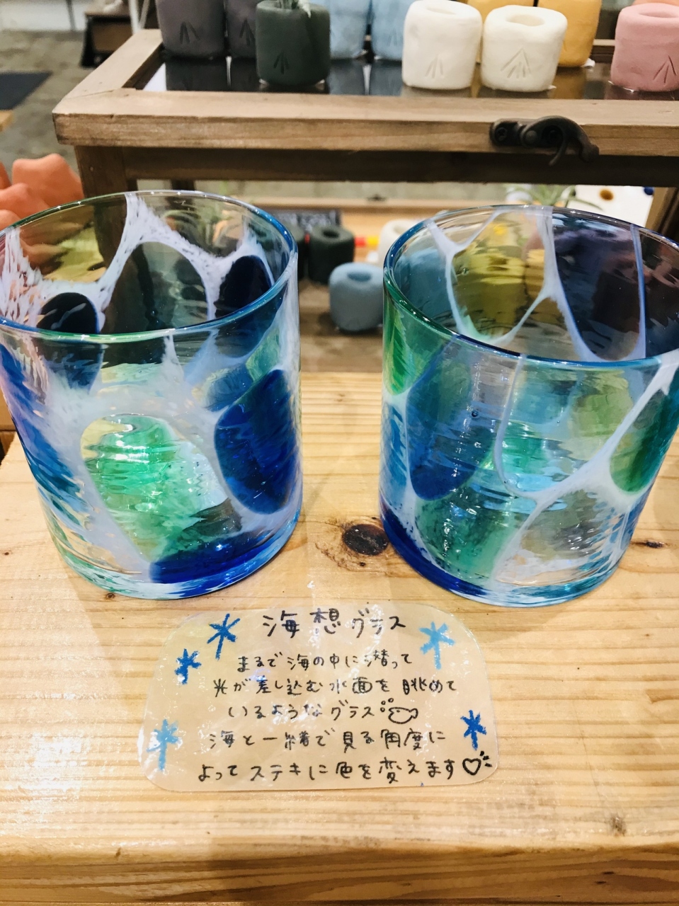 その他、琉球ガラス等の取り扱いもあり、今回はコースター以外にも、ガラスのコップも購入しました。