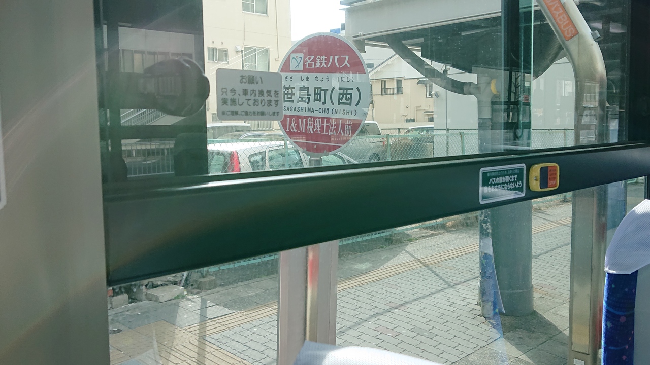 笹島町(西)バス停から、日曜日に14時台に乗車しました。1日を通すと、本数の多いバス停なのですが、この時間帯の本数はあまり多くありませんでした。もっとも、お客さんの人数もそれなりで、お客さん全員が着席できていました。