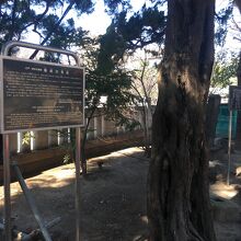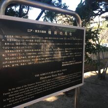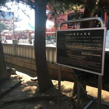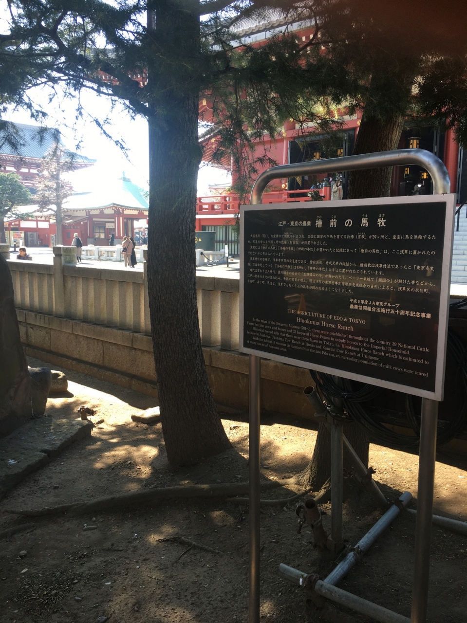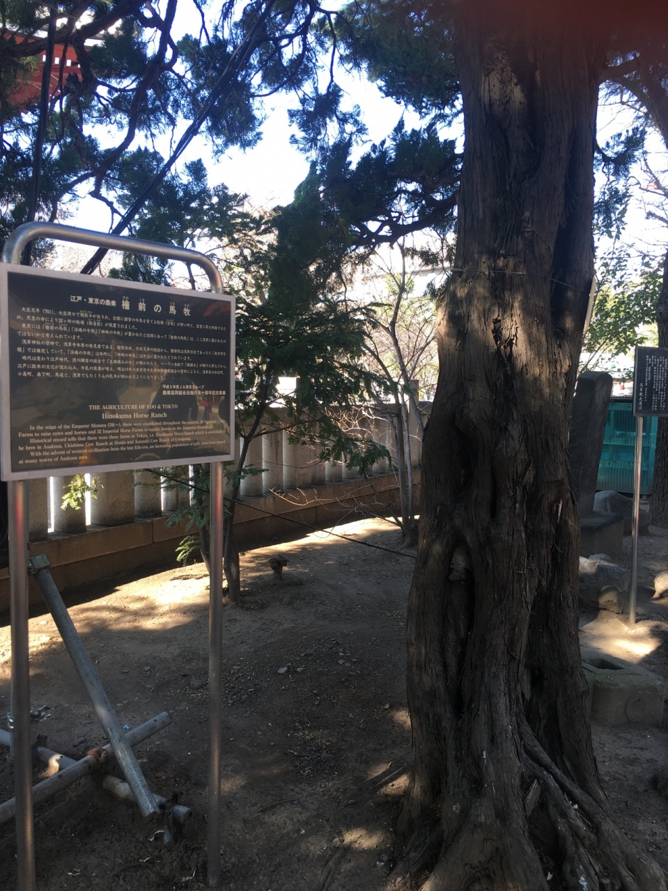 昔、馬牧があったと言われる場所で現在は浅草神社内の石碑が並んだエリアにあり説明看板の後方には高い木が立っているのみで、その後方は浅草寺本堂です。浅草でも乳牛が盛んだと記載がありました。木の枝が地面まで伸びているのが目につきました。