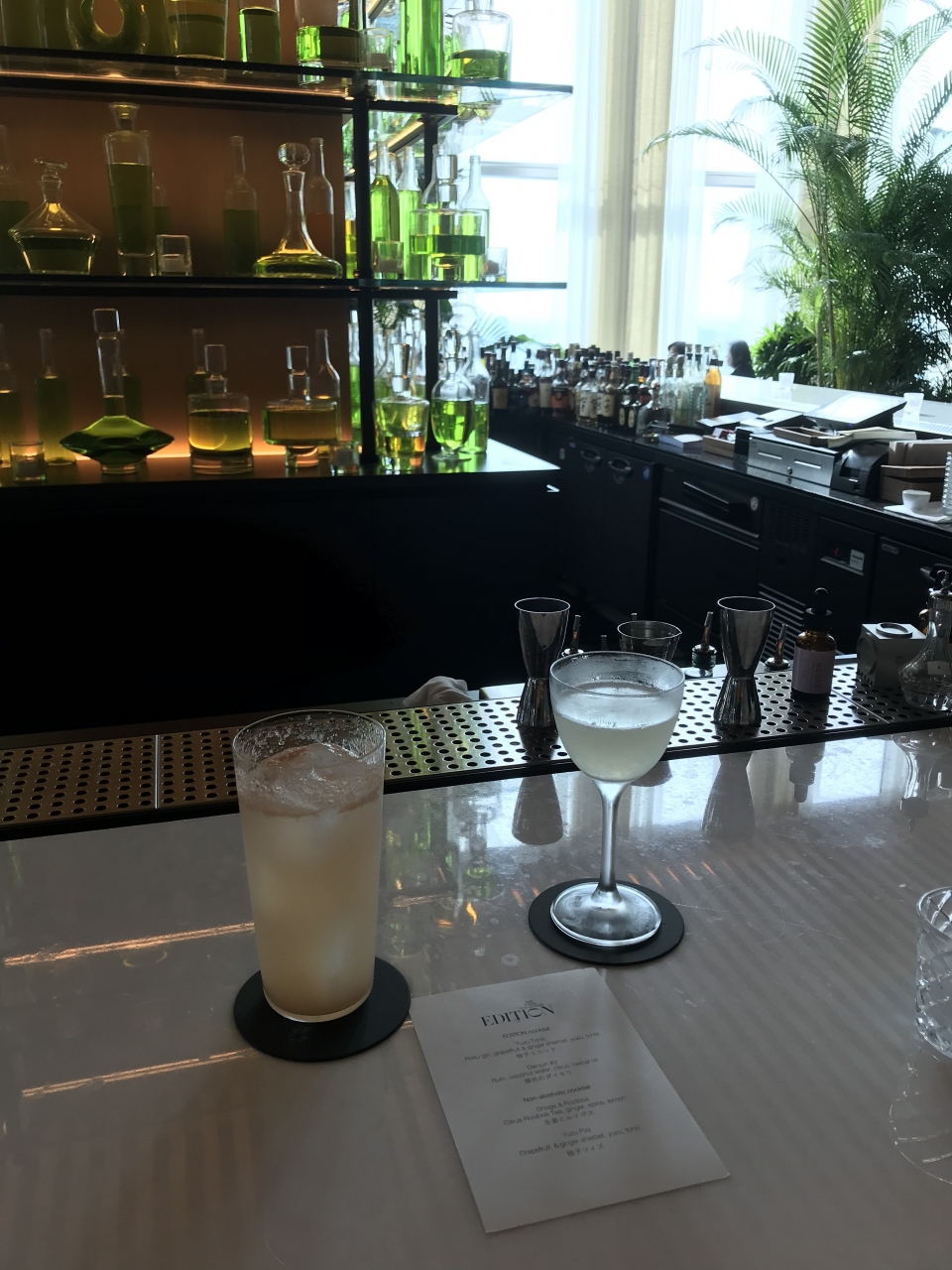東京エディション虎ノ門の31階、ロビーフロアにある「ロビーバー」でカクテルをいただきました。バーカウンターを囲うように席が設けられているほか、ゆったりしたソファー席もありました。