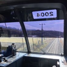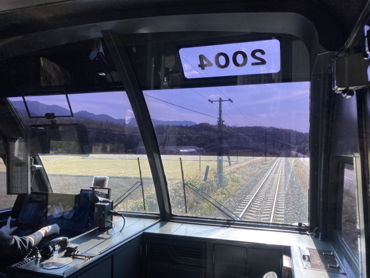 2000系ディーゼルカーの流線型グリーン車ですが。。。最前列の進行方向右側の2人席に座らない限り、それほどの展望は期待できません。運転席の後ろはちゃんとガラス張りになっていて、そこのデッキに立てば充分展望できますが、目線の高さに色ガラスが半分入ってきたりするので、それほど見通しが良いわけでもありません。