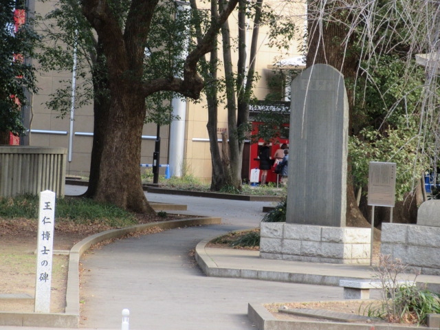 上野公園で、清水観音堂を参拝したのですが、その際にその神納道の裏手あたりにたまたま発見しました。結構大きな碑文で、二つ並んでいました。百済の王仁という方を記念して建てられたものだそうで、昭和に作られたものです。たくさんの文字が刻まれている大きな石碑でした。
