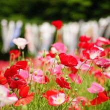 例年、4月~6月初めまでおこなわれるポピーまつり。特に5月に入ったGW頃からは赤や白のシャーレーポピーが一面に咲きみだれる。また、こどもの日に因み沢山のこいのぼりが花畑の上を気持ち良さそうに泳ぐ様子も見られる。