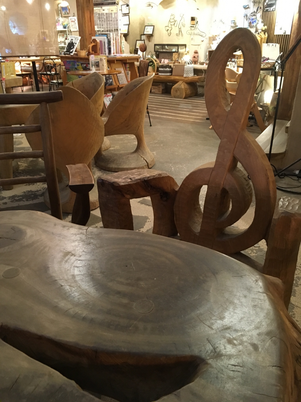 愛知池を一周する途中に素敵なカフェーを見つけました。丁度歩き疲れた時に、散歩道からちょっと入ったところに休憩場があります、自販機もあって無料で利用できます。よく見るとカフェーがあり、入って見るとピアノも置かれて椅子など原木の手作りで、以来よく利用してます