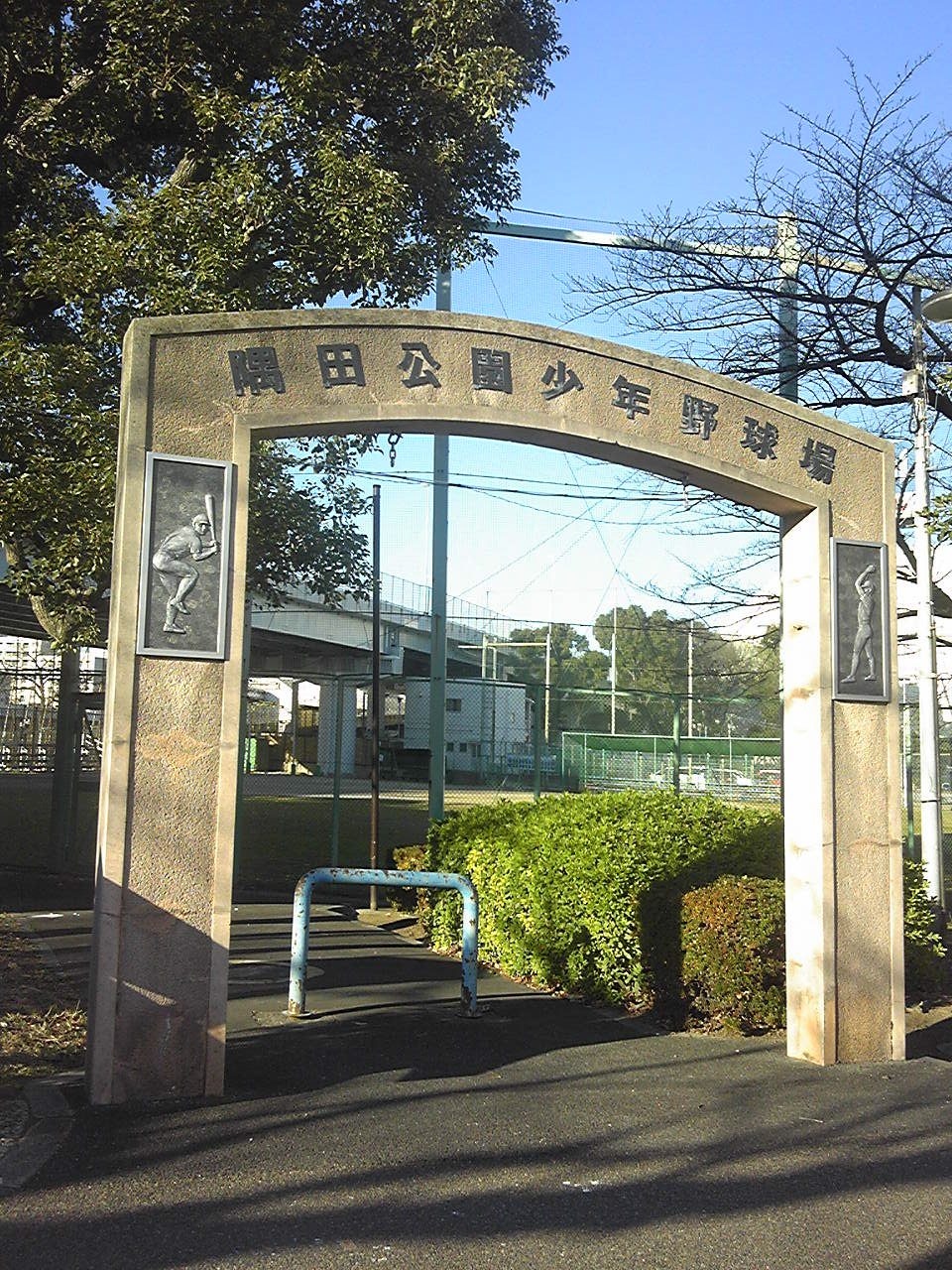 隅田川沿いにある、和菓子の名店、「言問団子」の店に隣接している、かわいらしい小さな野球場です。