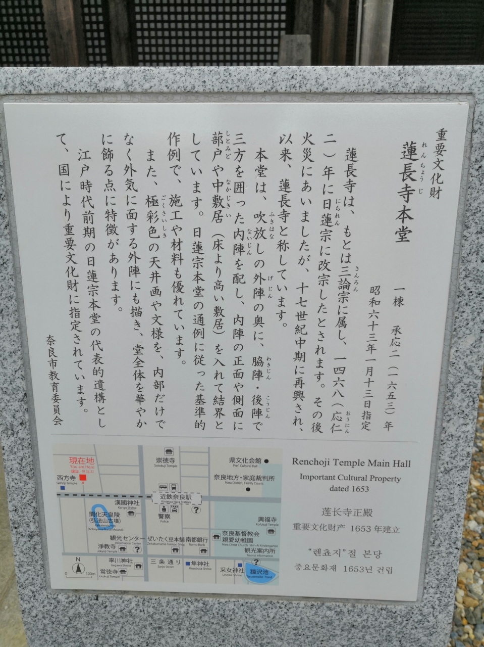 近鉄奈良駅からも程近い大宮通り沿いにあります。日蓮宗の開祖である日蓮上人が仏教研究のために奈良に滞在した際に長期に渡り滞在したとされる由緒ある場所です。こちらの特徴は本堂の入り口付近の天井一面に描かれている天井画です。本堂にあがらなくても見ることができました。観光スポットとしては有名ではないですが、境内の案内もわかりやすく、時間があれば来てほしい場所です。