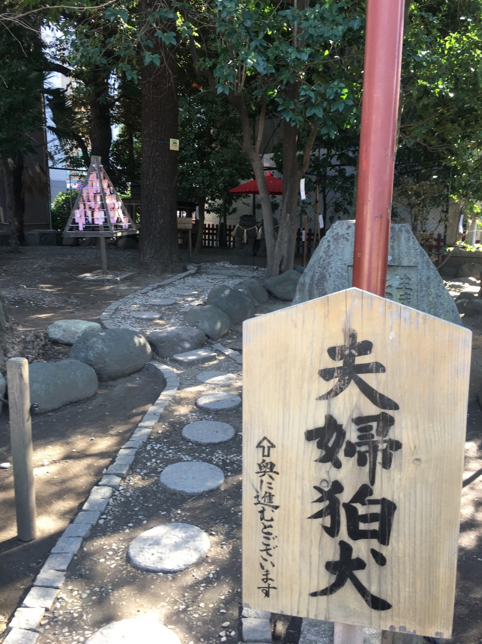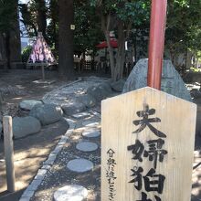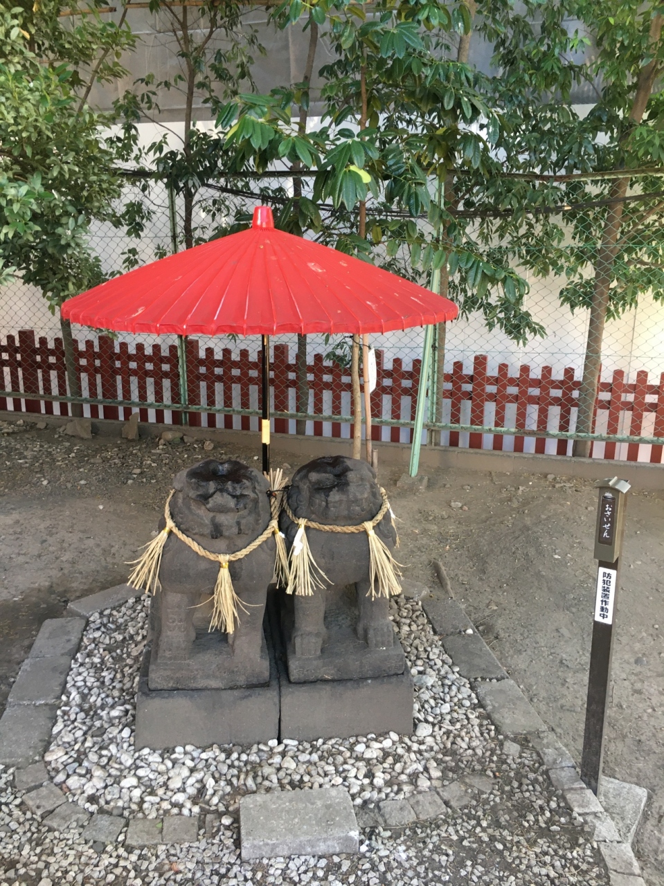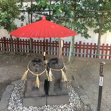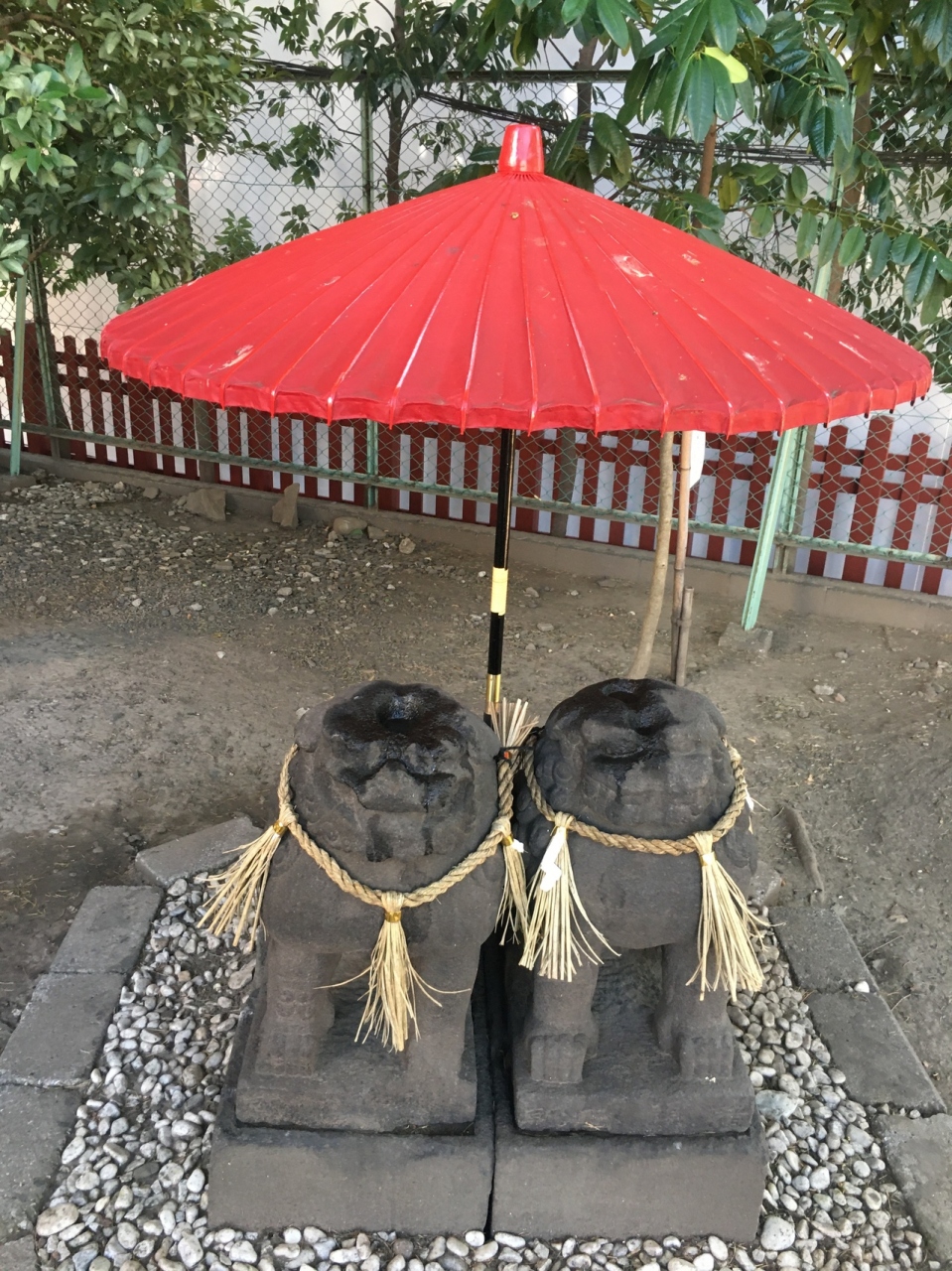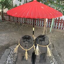 赤い目立つ傘の下に2つの石があり、狛犬の顔をしていましたが、ブルドックの顔にも見えました。2つ並んでいる姿が仲が良い雰囲気に見え、心和む場所でした。賽銭箱があり、小石が散りばめられ、しめ縄を巻いていました。