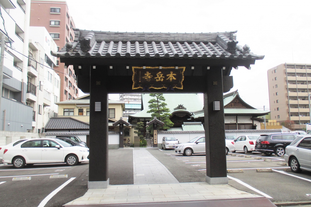 駐車場の先に、ポツンと山門だけが置かれた奇妙なお寺さんです。本岳寺は元々は聖福寺の末寺で本覚寺といったそうです。その昔、住職の西昌はたいへん囲碁が強いとの評判を得ていました。1496年(明応5年)に、少々囲碁の覚えありとして、京都の法華宗の日因上人が博多に赴き、お寺を賭けた勝負をします。結果は日因上人が勝利を収めてお寺を譲り受け、山号を先住の名を残して「西昌山」とし、本覚寺を本岳寺と変え、宗派も臨済宗から日蓮宗に変えたと伝えられているそうです。この日因上人は本因坊と名を残す囲碁の名人、あるいはその係累だと言われているそうです。