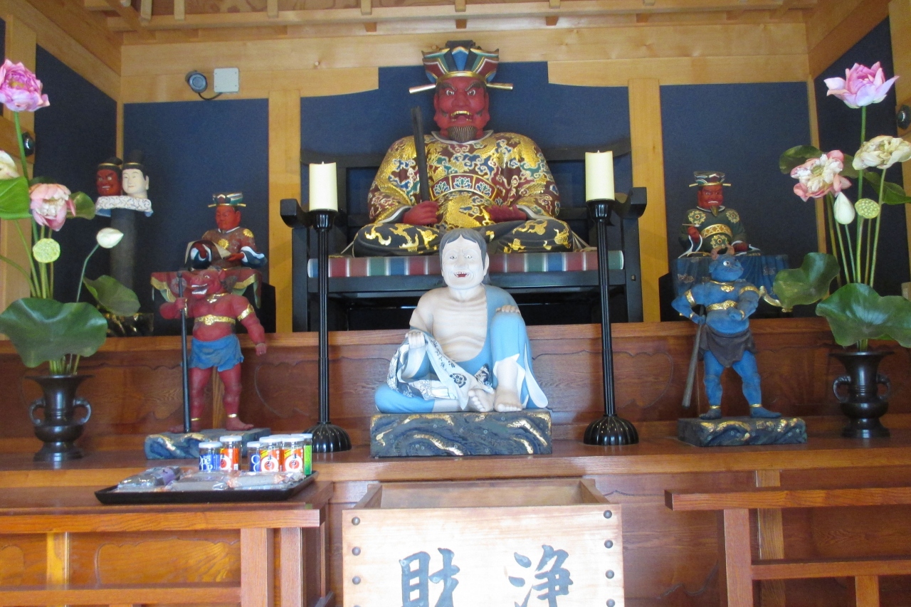 海元寺は選擇寺から官内筋を北へ20mくらい進んだ、道路の反対側にありました。綺麗な濃紺のタイルが貼られた近代的な本堂です。こちらのお寺さんでは閻魔堂で毎年1月と8月の16日に閻魔さまのお祭りが行なわれます。この時のお供え物は「こんにゃく」とのことです。これは閻魔様にではなく、三途の川の畔にいる「奪衣婆」(衣を奪うお婆さん)に供えるのだそうです。このこんにゃくは、腹の中の砂を取る働きがあり、ついでに「下のやまい」まで取って欲しい、という願いを込めて供えるのだそうです。お婆さんは、根はやさしいので、お供えの功徳によって、人々の願いを聞き入れてくれるのだそうです。子供の病気をなおしたり、母乳の出をよくしたり、下のやまいを取り除いたりしてくれるそうです。