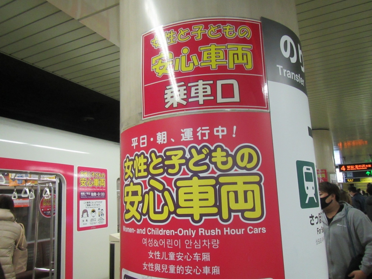 女性専用車両が連結されていて、7両編成の車両のちょうど真ん中の4両目が、平日朝の始発から9時まで女性専用となりますが、”協力”ということで、時間が無くその車両に乗ってしまった場合など、男性の乗車が禁止されている訳ではないようです。