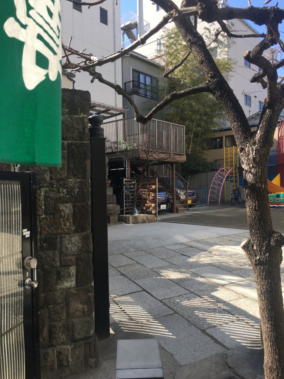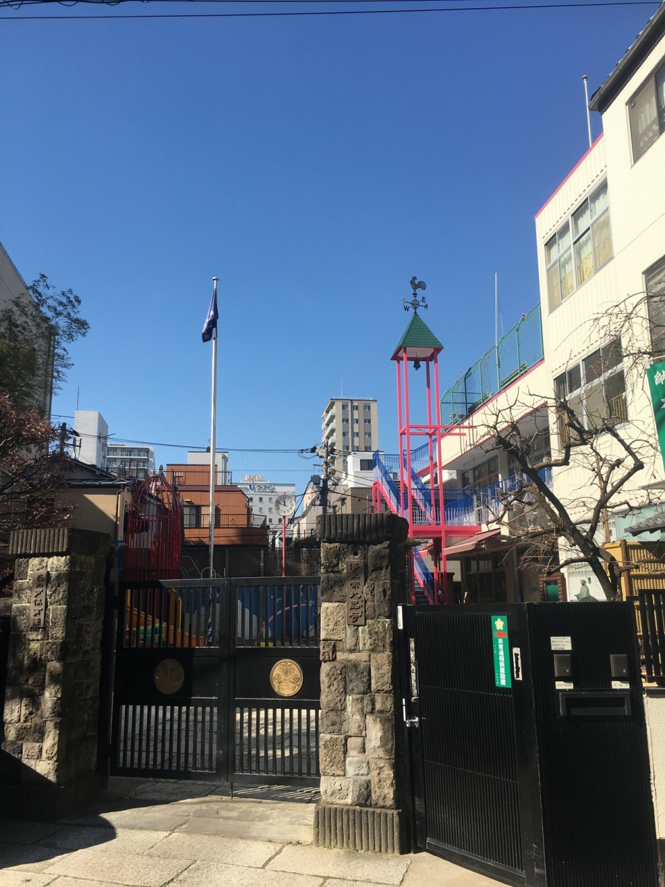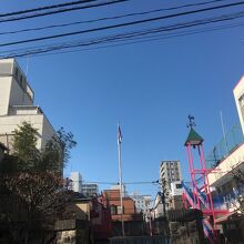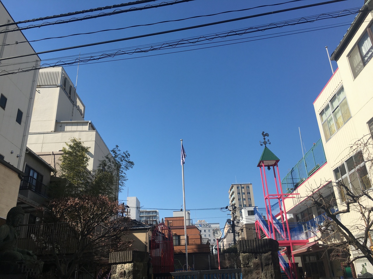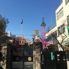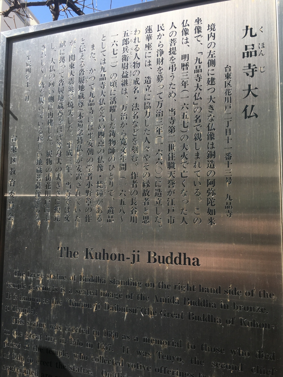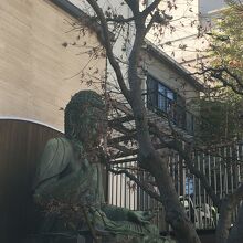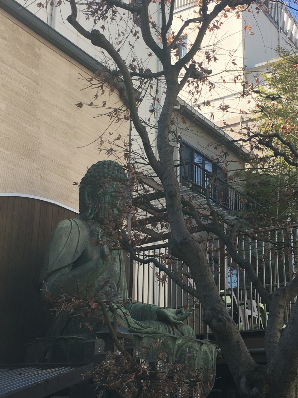 境内の左側に建つ大きな銅像で阿弥陀如来坐像です。1657年の明暦の大火で亡くなられた方の菩提を弔うため建立されました。幼稚園も兼ねた寺院なので中には入ることが出来ず、門前からの見学で大仏の前には木があります。