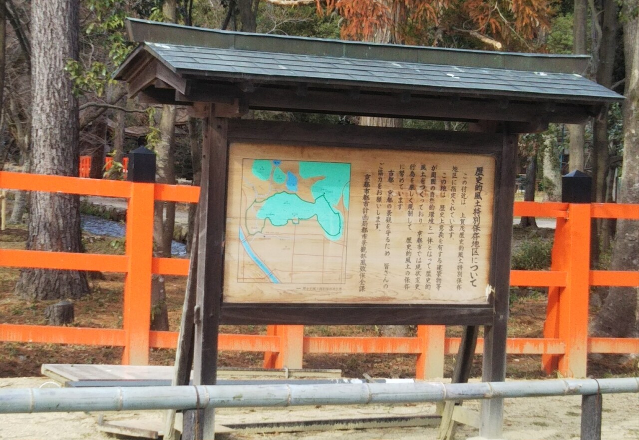 よく観光スポットに出かけるとみかけるこの伝統保存地区の説明書き。京都では昔ながらの景色を今後に残していくためにこういった保存地区がたくさんある。この写真は上賀茂神社の南側の上賀茂本通にあったもの。ちょっとした道にできた小さい橋があった付近