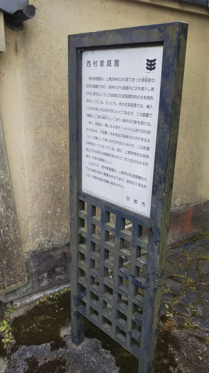 上賀茂神社を見終わった後、上賀茂本通にそって東の方向へ向かったときに見つけたけど門が閉まってたので門の前にあった説明書きだけ見てきた。上賀茂神社の社家であった錦部家の旧宅の庭園。この前に流れてる明神川から庭園内に水を導入し再び川に戻してるそう。