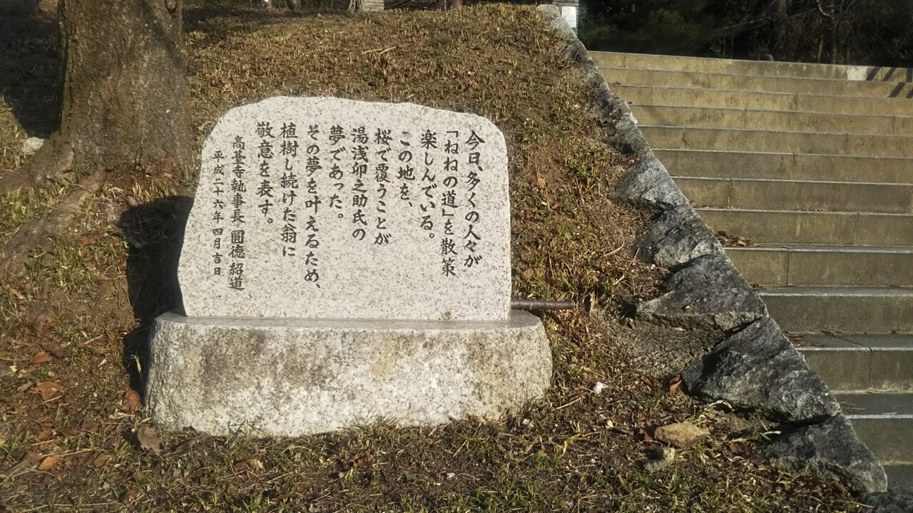 円山公園音楽堂あたりからずーっと、途中曲がり道がありながらもねねの道を通って道の南の端の高台寺公園があるあたりまで移動してきた。そこで見つけたのがこれ。この地を桜で覆うことが湯浅卯之助氏の夢であったと書かれてる。
