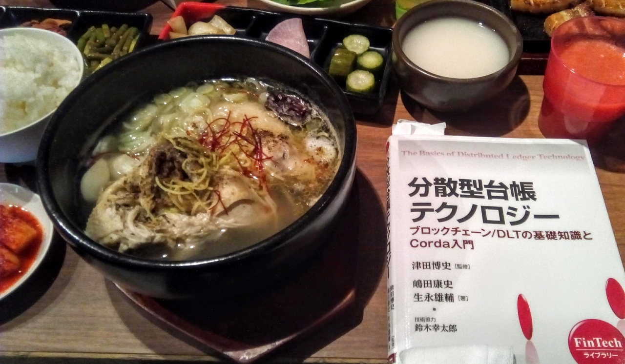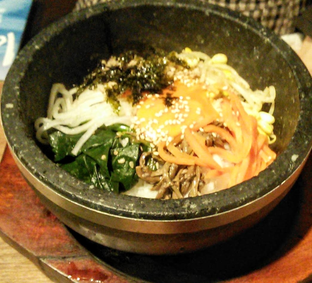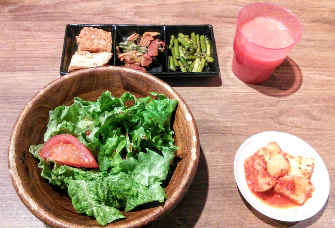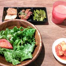 ビルの5階にあり、エレベーターを降りたところに、キュウリや大根の漬物の瓶が並んでいます。焼きキムチ付きサムギョプサルセットを注文すると、お店の入口に置かれていた保存瓶の漬物3点セットが、お肉を巻く葉野菜や特選味噌や塩タレ、わかめスープと共に運ばれてきました。その他に、手作り人参ジュース、おかず3点セット、野菜サラダ、カクテキが次々と並び、あっという間にテーブルがいっぱいになってしまいました。セットの石焼きビビンバはごはん少なめでしたが、香ばしいおこげができておいしくいただけました。唐辛子で暑くなってきても、テーブルに氷入りのお水のポットが置かれているので、助かりました。用がある時のみボタンで店員を呼ぶという韓国料理店にはよくあるシステムで、料理が運ばれた後は店員は奥に引っこみ放置してくれるので、テーブルいっぱいのお料理をゆっくり食べることができました。