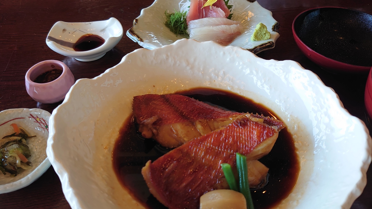早めに行ったつもりでしたが、もうお客さんがいて、少し並びました。1階がお土産、階段があり2階がお食事処です。伊豆の温泉宿をキャンセルしたため、ようやく金目鯛をいただくことができました。海沿いにあり、大きめの駐車場があります。