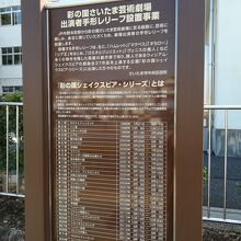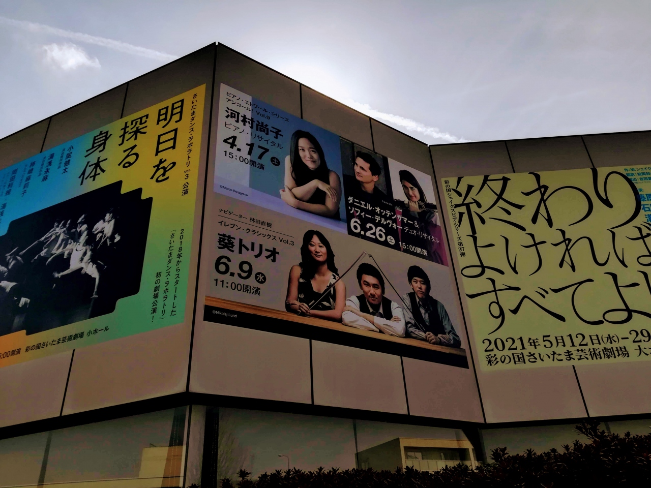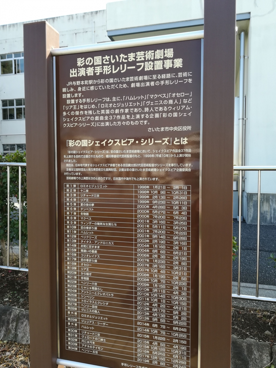 蜷川幸雄氏の舞台や音楽コンサート等でよく使われる劇場。今はコロナで公演中止がほぼありませんが、通りがかった日には一般向けの音楽コンクール予選をやっていました。劇場の近くの与野西中の前には、舞台の出演俳優の手形のレリーフがずらっと並んでいます