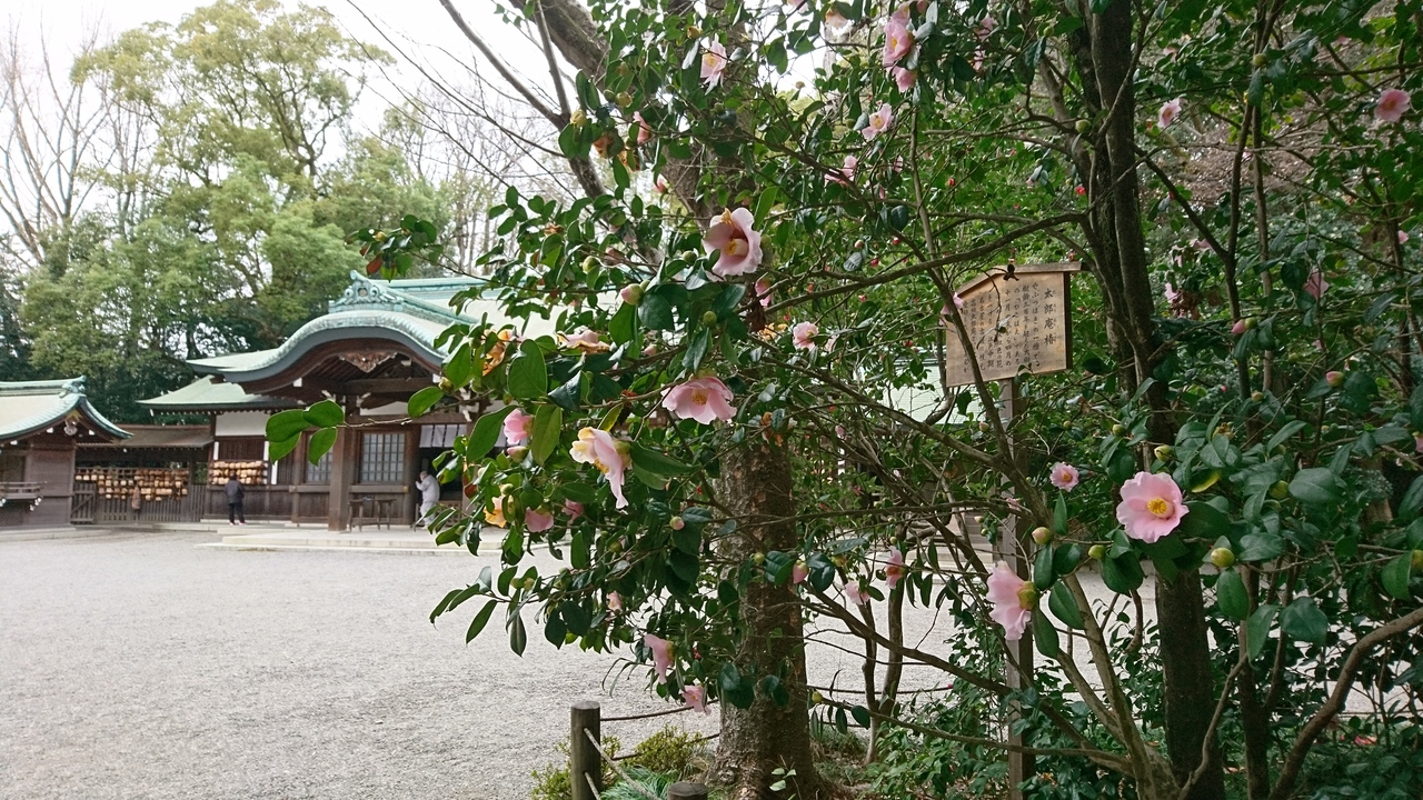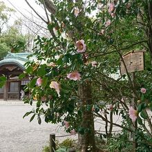 境内にある太郎庵椿がピンク色のキレイな花を咲かせていました。