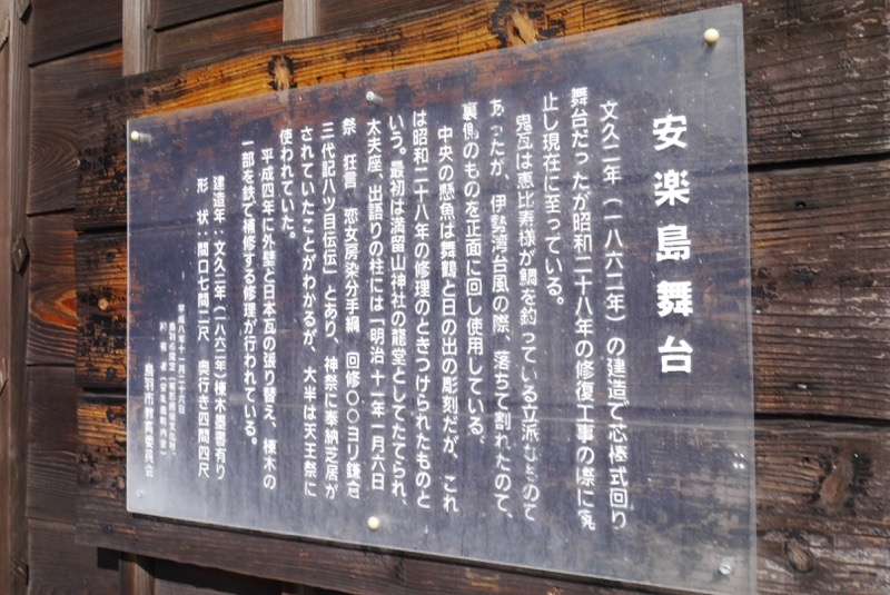 とくに行事のないときは一般に開放されていない場所ですが、説明パネルは施設の壁面に設置されていますので、想像をめぐらせることができます。安楽島バス停からすぐのところにあり、伊射波神社へ行く途中にあるので立ち寄りました。木造の建物で、昭和にいちど修復され、いまも大切にされているようすがうかがえました。