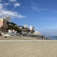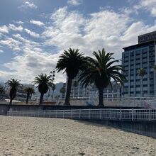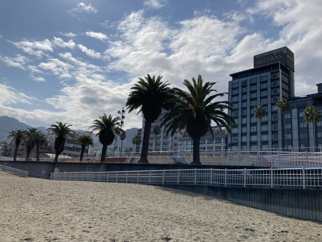 熱海駅から徒歩10分ぐらいでつきます。南国ではないですがヤシの木がいい感じです。なんとなくですがタイのパタヤ的なものを感じます。まだ緊急事態宣言発出中ですが、結構人がいます。日帰りの旅行先として人気なんでしょう。熱海が復活しつつありますね。
